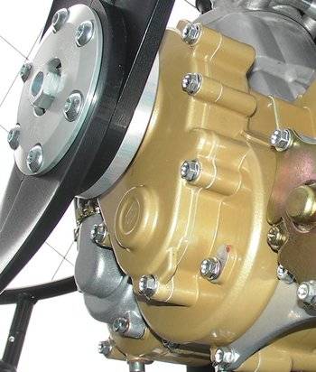 This gear transmission has a reduction ratio of 2.8: first The gears and integrated centrifugal clutch running and oil, and thus almost no wear.